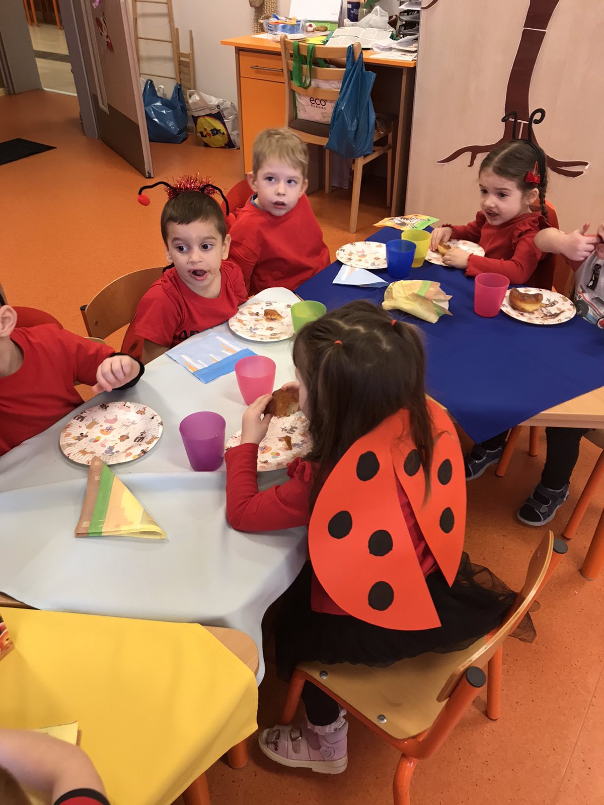 A jelmezeket a csoportokban a gyermekek – az óvónénik és dajkák segítségével – maguk készítették el.