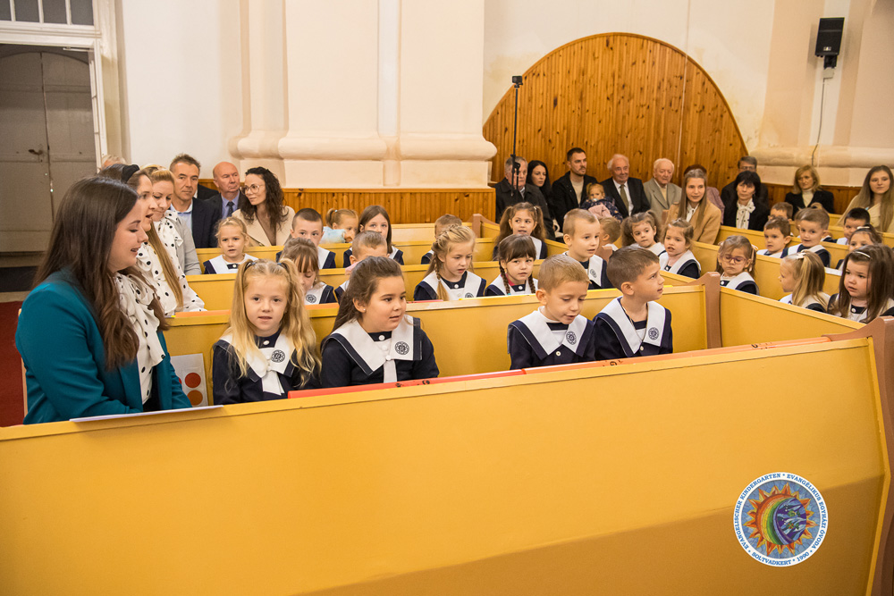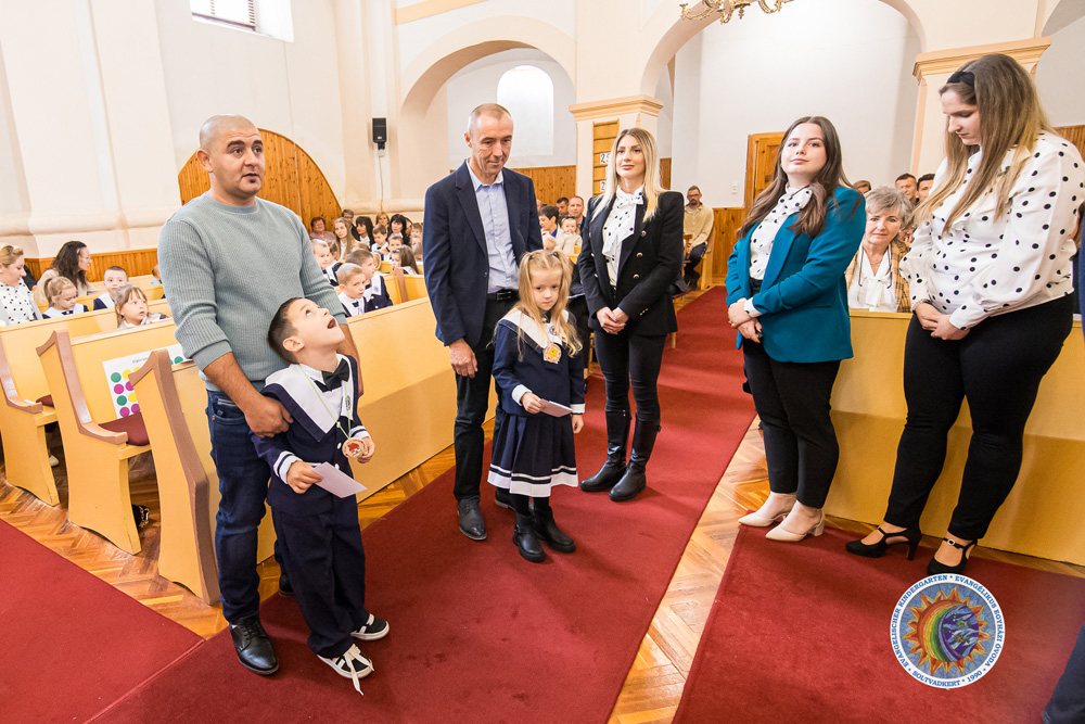 Az ünnepi alkalom keretében fogadták be és áldották meg az új óvodásokat, akik szüleikkel együtt léptek az oltár elé, ahol Kondor Péter áldásban részesítette őket. Emléklapot és egy jelükkel ellátott fa nyakbavalót kaptak ajándékba, majd a jelen lévő közel nyolcvan középső- és nagycsoportos óvodás verssel és énekkel köszöntötte új társait, kifejezve, hogy szeretettel fogadják őket közösségükbe. Megrendítően szépen szólt a nagyszámú gyermeksereg éneke – fennállása során az egyik legnagyobb létszámmal, száztizenöt kisgyermekkel és több új dolgozóval kezdheti meg óvodánk a tanévet.